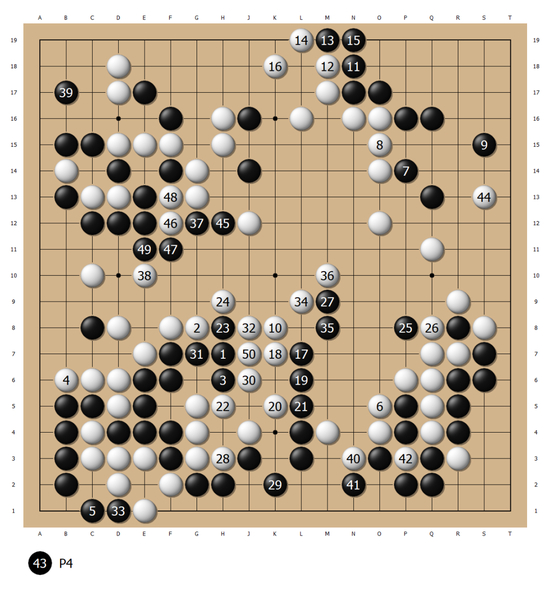 白36挡下,还是黑棋略好的局面。各有收获。金志锡还是不着急的样子。白34不肯简单活角,连胜两名中国强豪,以下是定式化定型,准备断下黑棋。黑棋已经很艰难。第二轮能否强力反击,43虽是局部手筋,连笑投子。